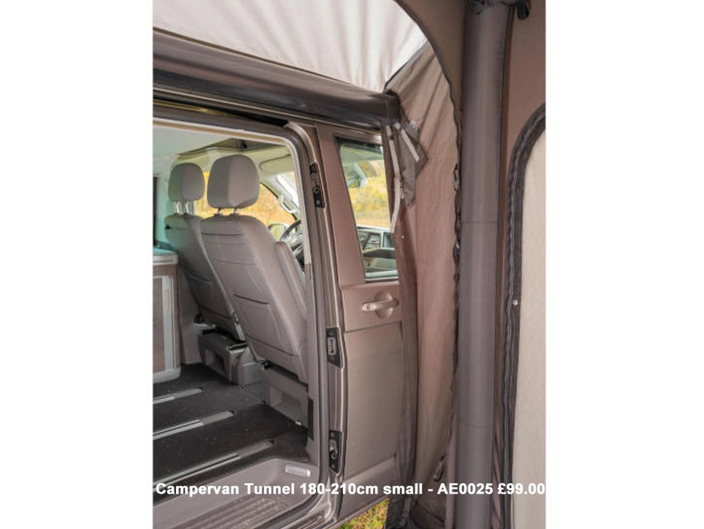 A range of optional tunnel connections is available to ensure a secure and weatherproof fit between the awning and your vehicle. Options are designed to suit small campervans such as VW-style models, taller panel van conversions, standard motorhomes, and XL motorhomes. Each tunnel provides a reliable connection while maintaining full drive-away functionality, allowing the awning to remain freestanding when the vehicle is disconnected.