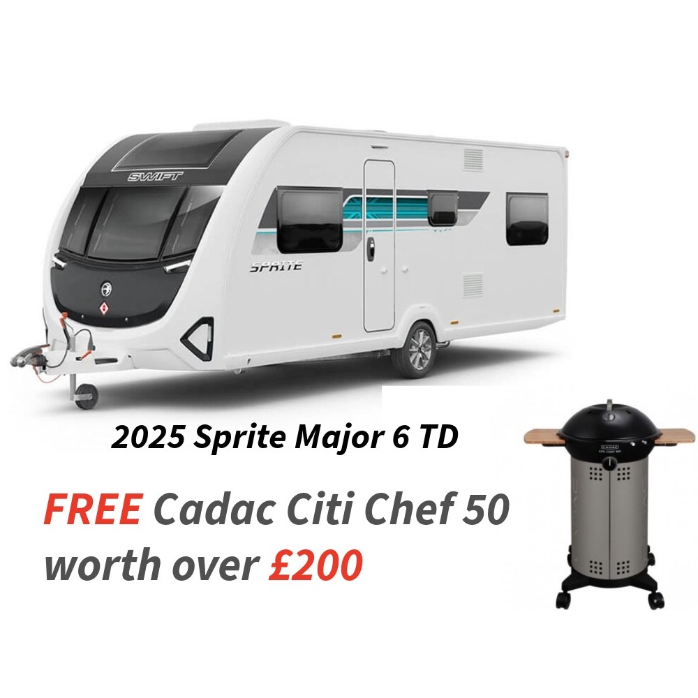 This 2025 Sprite Major 6TD is a very popular family 6 berth single axle caravan with fixed bunk beds, and offers a separate toilet and shower cubicle.The Sprite range has levelled up its offering with an exceptional standard of specification. This family caravan is prioritising value for money which continues to be a family favourite.