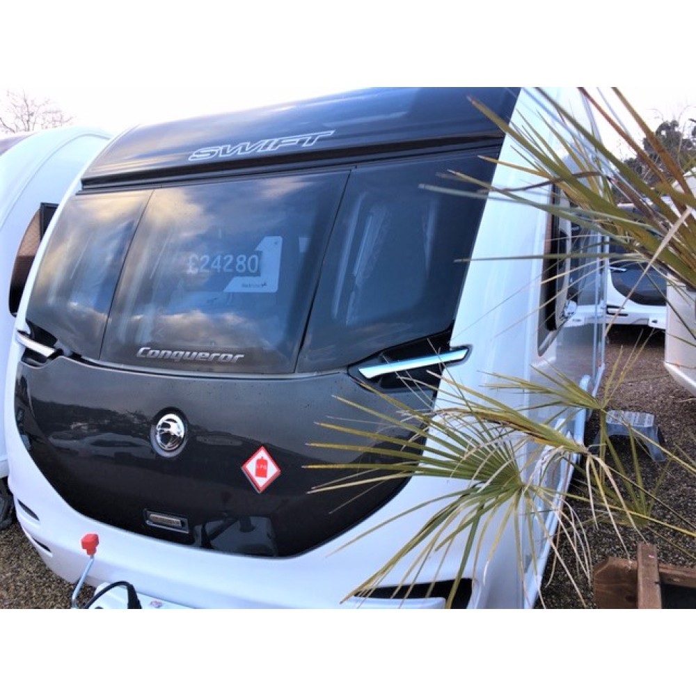 Thanks to its SMART Plus construction the new Swift Conqueror Caravans incorporates an aerodynamic exterior design that combines a sweeping front aspect with new stylish graphics, chrome effect grab handles, sleek sunroof, and full height GRP rear panel that together creates a strikingly sleek silhouette.
